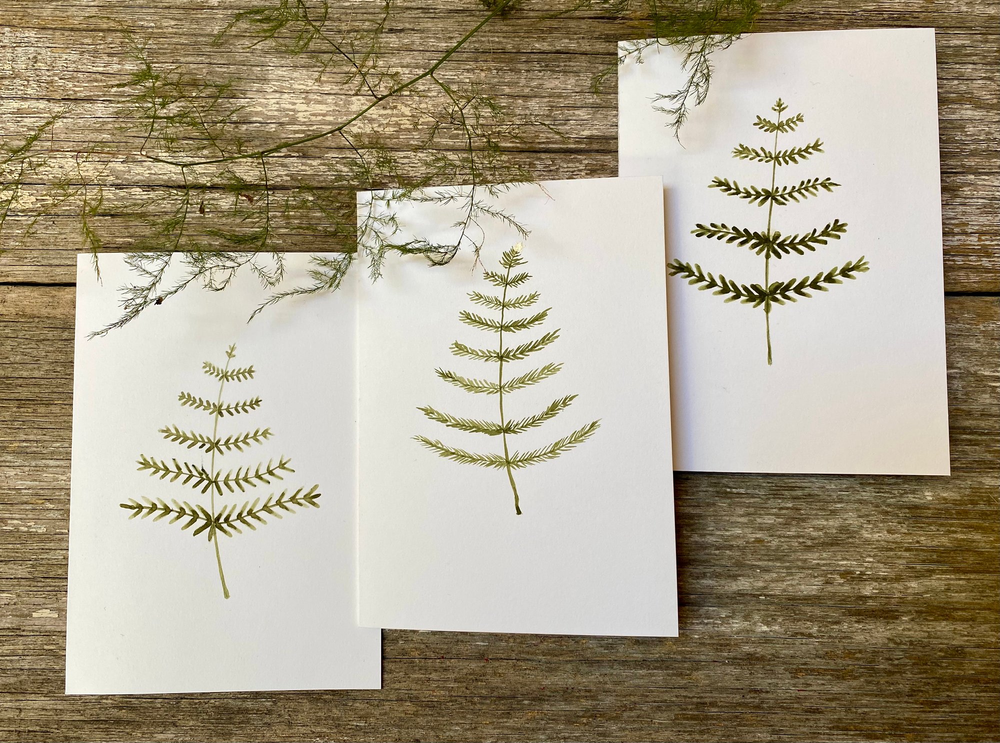 Hand painted simple fir tree or leaf tree Christas cards. These cards are painted in watercolour on antique white artists 220 gm card. Each card is individually painted so there will be subtle variations in the colour and tree designs. Merry Christmas is stamped inside and a recycled envelope is included. These cards create a unique and gentle Christmas card.