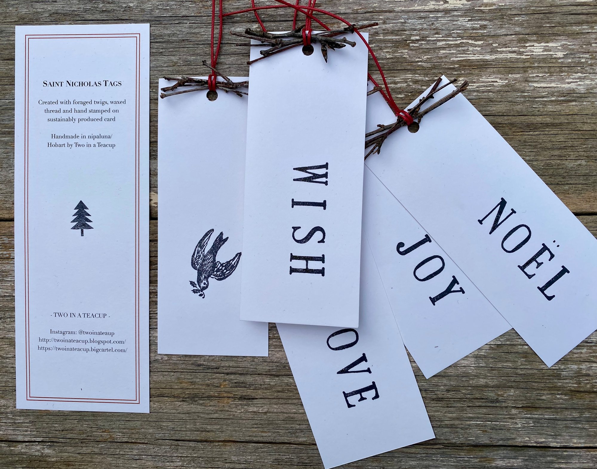 Twig Tags - A Christmas tag with natural birch twigs and hemp twine make these a unique addition to your gift wrapping. Blank on the reverse these tags measure approximately 15cm x 6cm. Choose from WISH, JOY, LOVE, NOEL and the DOVE. Sold in mixed sets of 5 - please indicate if you wish to purchase a set of one design only.
