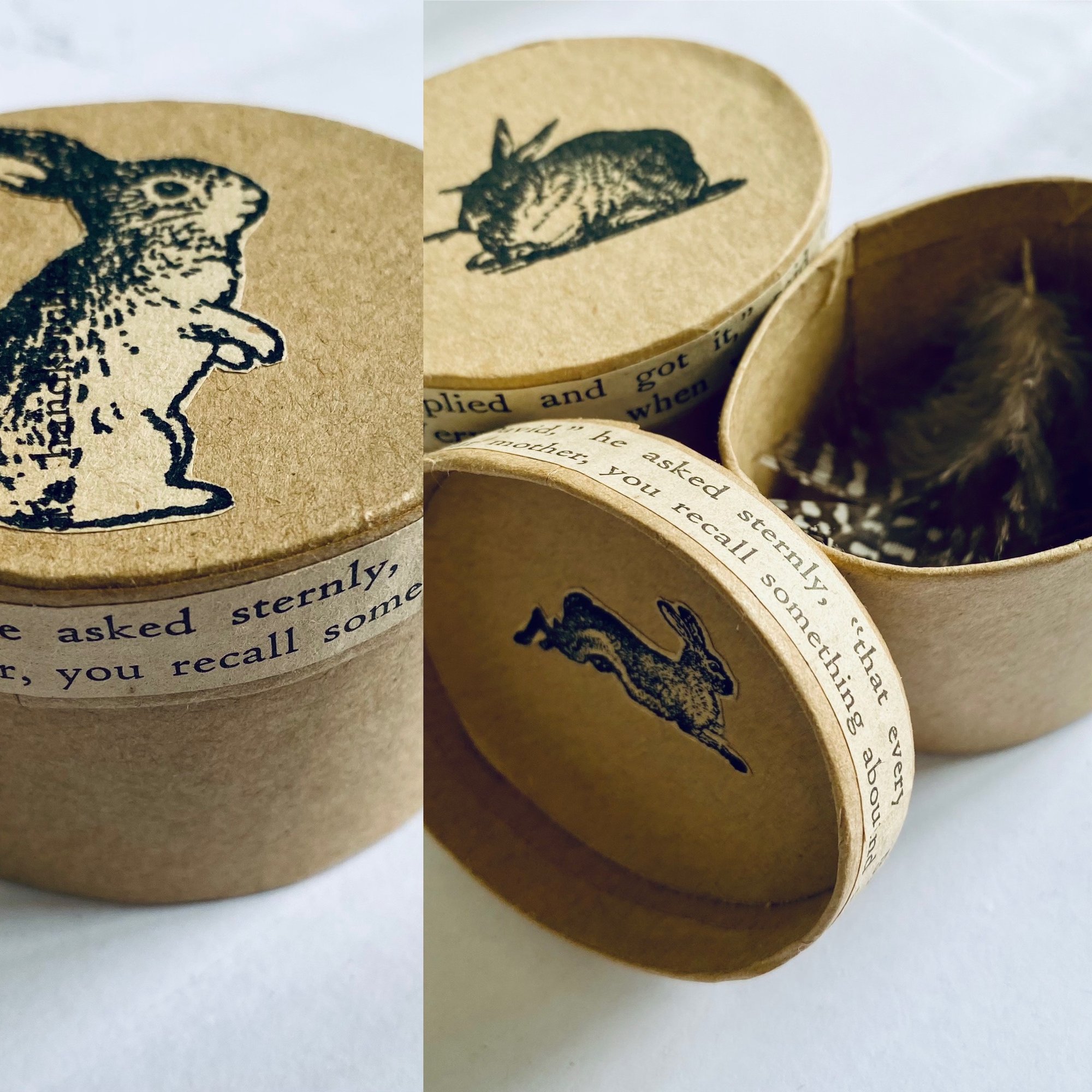 Little oval treasure boxes with a bunny stamped on the lid and a different rabbit image inside. Vintage book paper edging and feathers inside make for a lovely place to hold a treasure. A perfect small box to contain an Easter treasure - chocolate, little note, egg shaped stone etc. Children will love storing their special finds inside.