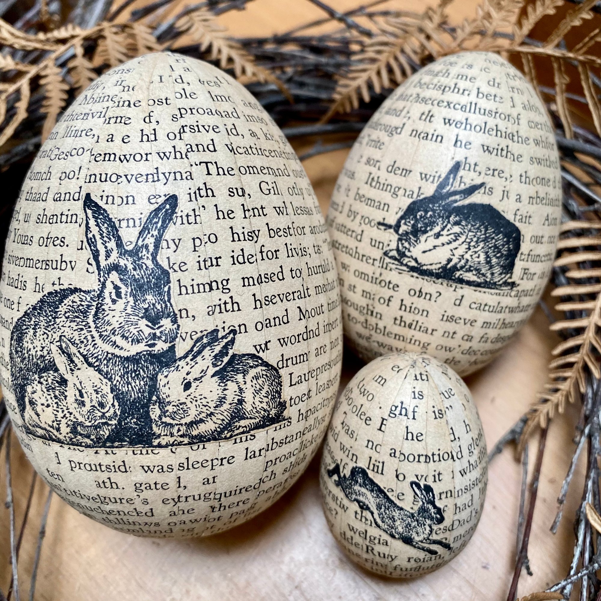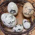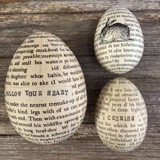 Each egg is carefully covered in a range of vintage book paper. The texts and fonts all vary and the eggs are also hand stamped with a range of carefully selected words and collaged images.