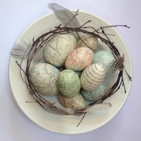 There are two sets of pastel coloured map eggs which look stunning displayed with feathers in a dish or nest accompanied with tiny fairy lights - so many ways to display these subtly toned eggs. Pastel map set of 6 eggs is in soft pinks, blues and whites. The set of 5 eggs has a range of soft greens and pink coloured maps.