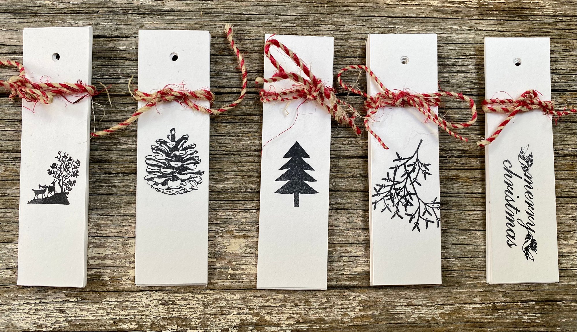 Sold Out -Pinecone and sets of Tree, Deer and Bird Gift Tags are long and elegant, hand stamped tags on artists 250gm card and blank on the reverse side. These are a beautiful gift tags for presents at any time of the year but look especially stunning at Christmas and on gifts for those who love nature. Sold in packs of 5 tags, measuring approximately 15cm x 5cm. Choose from black or red twine. Sets have one of each design or can be purchased as a pack of five tags of the one design - choice can be indicated at checkout.