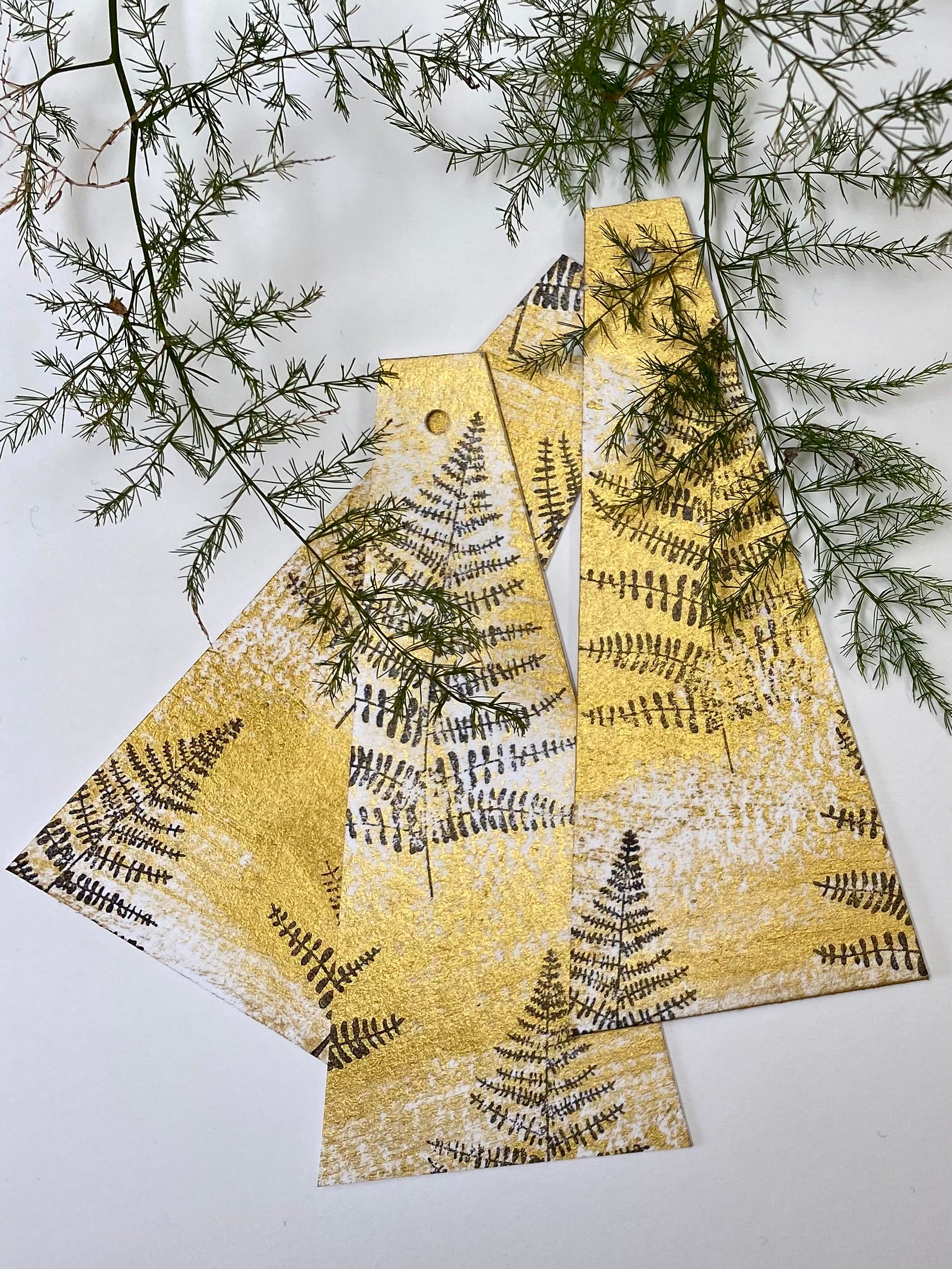 Sold Out -Gold Lustre Tags - These tags are created using gold lustre paint with stamped images on 300gm acid free artists paper. Each tag will vary slightly due to the handmade creative process. Sold in sets of 6 comprising 3 large and 3 medium sized tags. Subtly shaped to echo a Christmas tree these golden tags will make a striking addition to your Christmas wrapping. Large - 12.5cm long | Medium - 10.5 long Tese tags are now Sold Out.